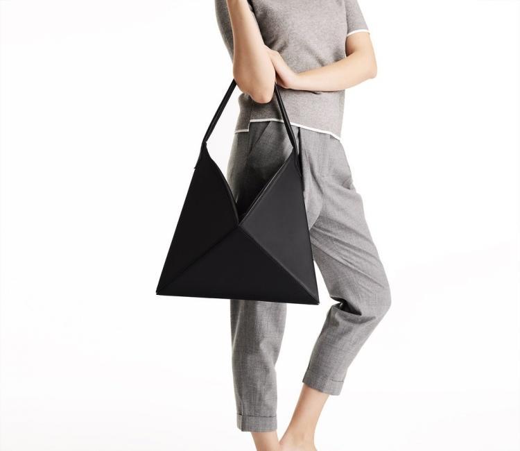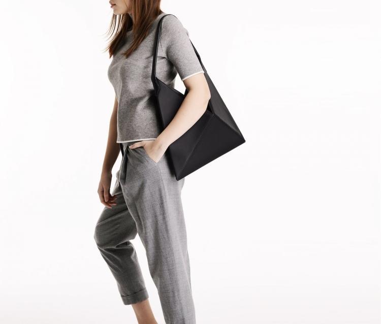 The Origami Tote Bag was born of our desire to make a bag that didn't just carry your stuff but enhanced your look and comfort. Our "Origami" design was inspired by the ancient Japanese paper-folding art, developed using sophisticated mathematical relationships and minimalist construction techniques. Crafted from smooth vegan leather and accented with sturdy folded sides, this classic black stunner is a modern classic.